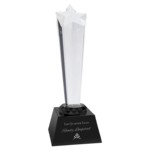 Optic crystal clear rising star shoots out from black circle riser. Award is attached to black crystal base.
