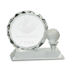 CRY161 - 5 1/4" Round Facet Crystal with Golf Ball on Clear Pedestal Base
