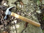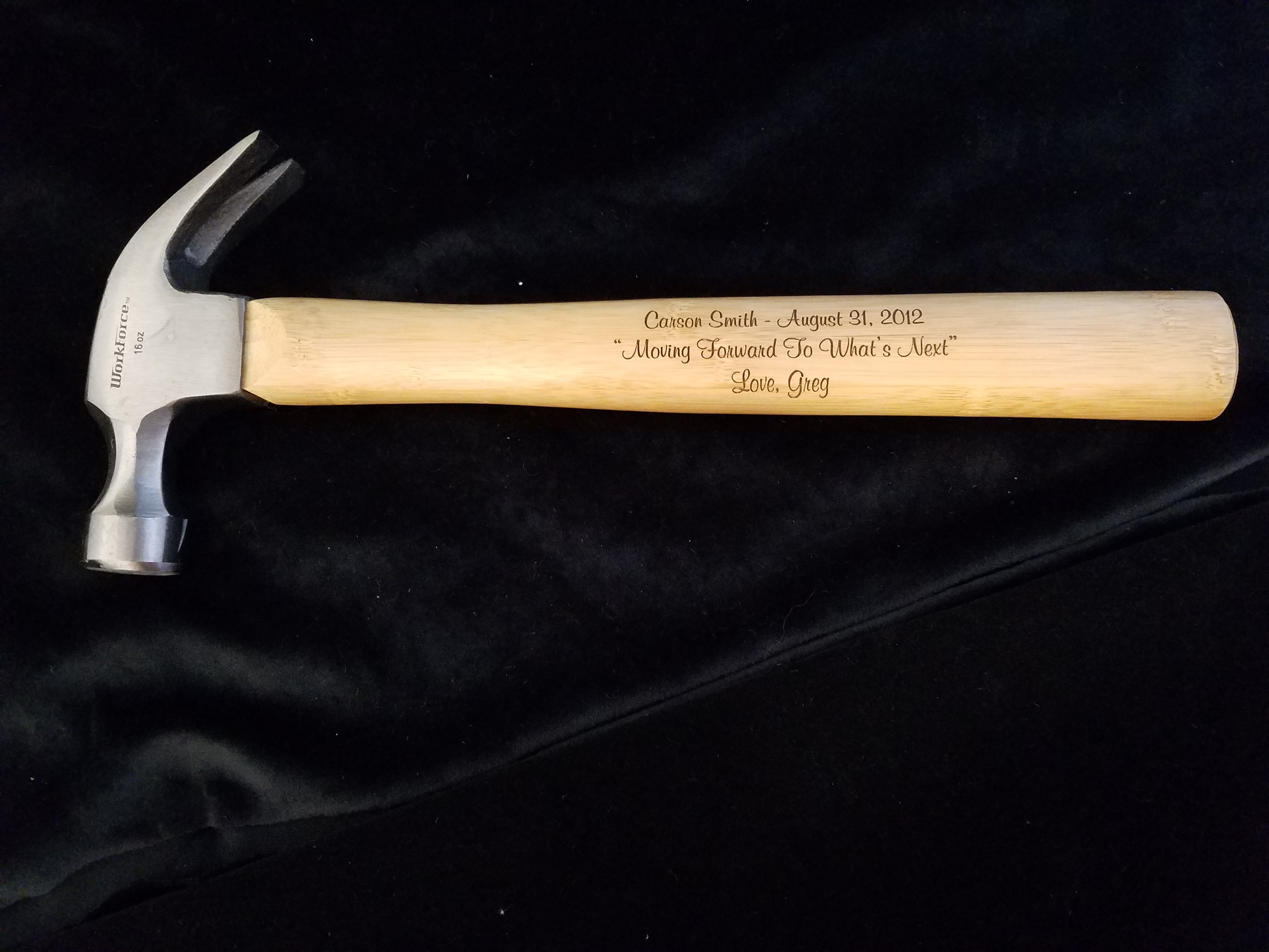 13" 16 ounce wooden claw hammer with custom text laser engraving on one side.